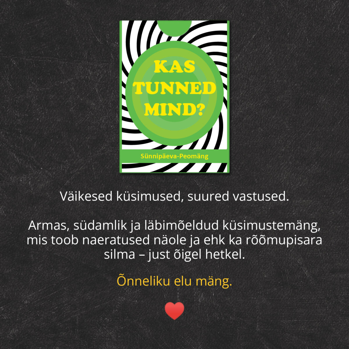 Sünnipäeva-Peomäng KAS TUNNED MIND? on armas küsimustemäng, mis avab ja ühendab südamed. Kaardid viivad teid teemadeni alates lapsepõlve lemmikutest ja perelugudest kuni iseloomu, harjumuste, unistuste ja tulevikumõteteni — samuti reisimälestuste, mängulise fantaasia ning igapäevaelu väikeste, ent tähenduslike detailideni.